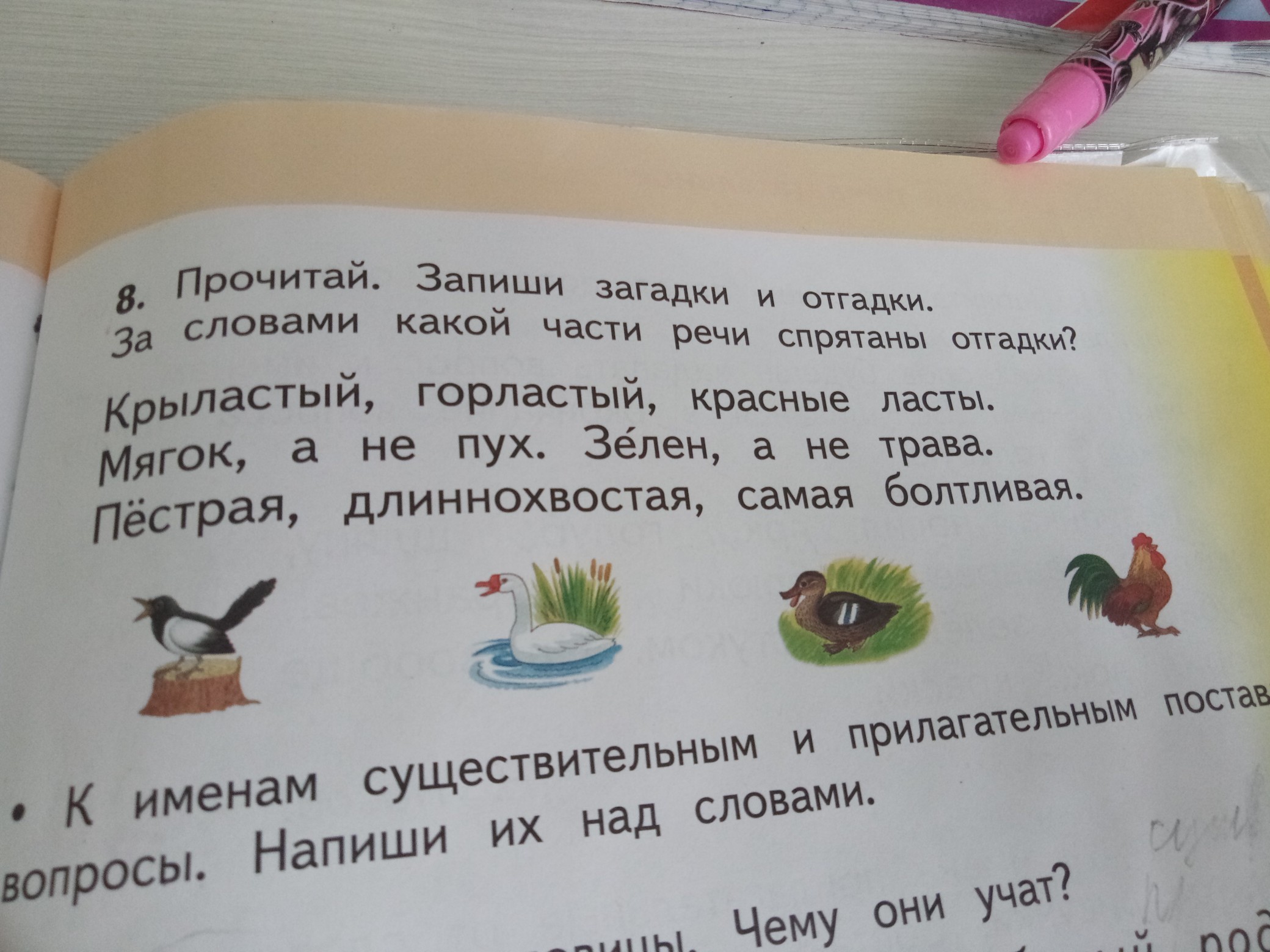 Как сделать задание Прочитай и запиши загадки и отгадки за словами которой части речи спрятаны отгадки к именам существительным и прилагательным Поставь вопрос напиши их над словами