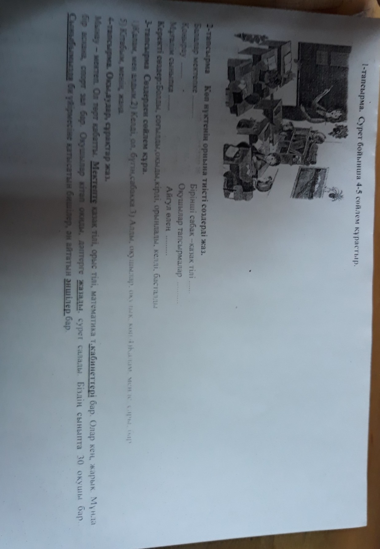 1.мен қалам алдым.2.ол бүгін сабаққа келді.3.Оқушылар көп оқулық алды.4.менде сары қалам бар.5.менің кітабым жаңа