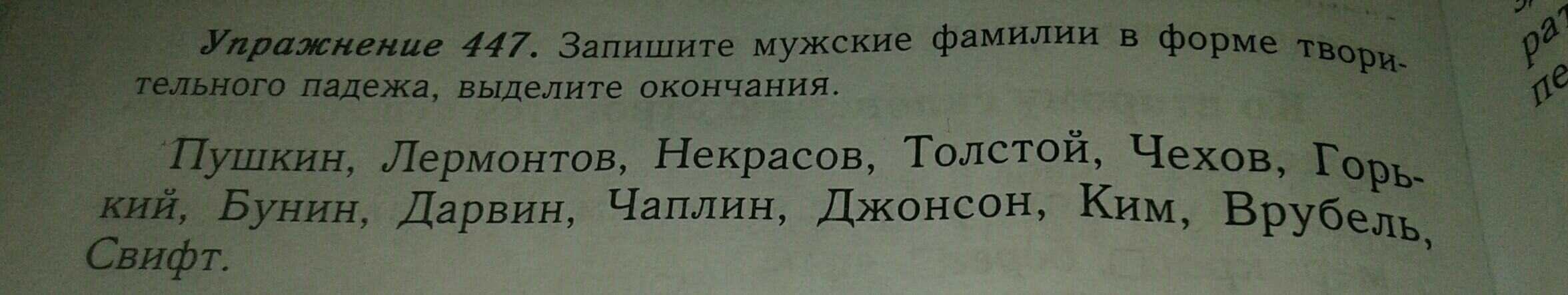ПушкинЫМ, ЛермонтовЫМ, НекрасовЫМ, ТолстЫМ, ЧеховЫМ, ГорькИМ, БунинЫМ, ДарвинОМ, ЧаплинОМ, ДжонсонОМ, КимОМ, ВрубелЕМ, СвифтОМ.