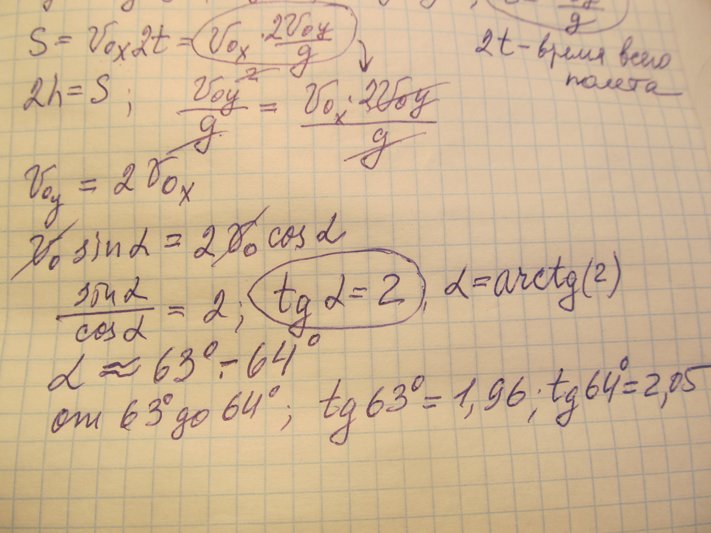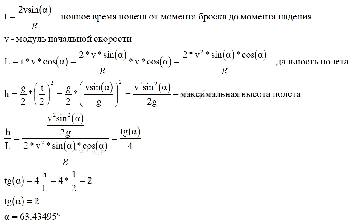 Под каким углом нужно бросить тело, чтобы высота подъёма равнялась половине дальности полёта? Сопротивление воздуха не учитыват