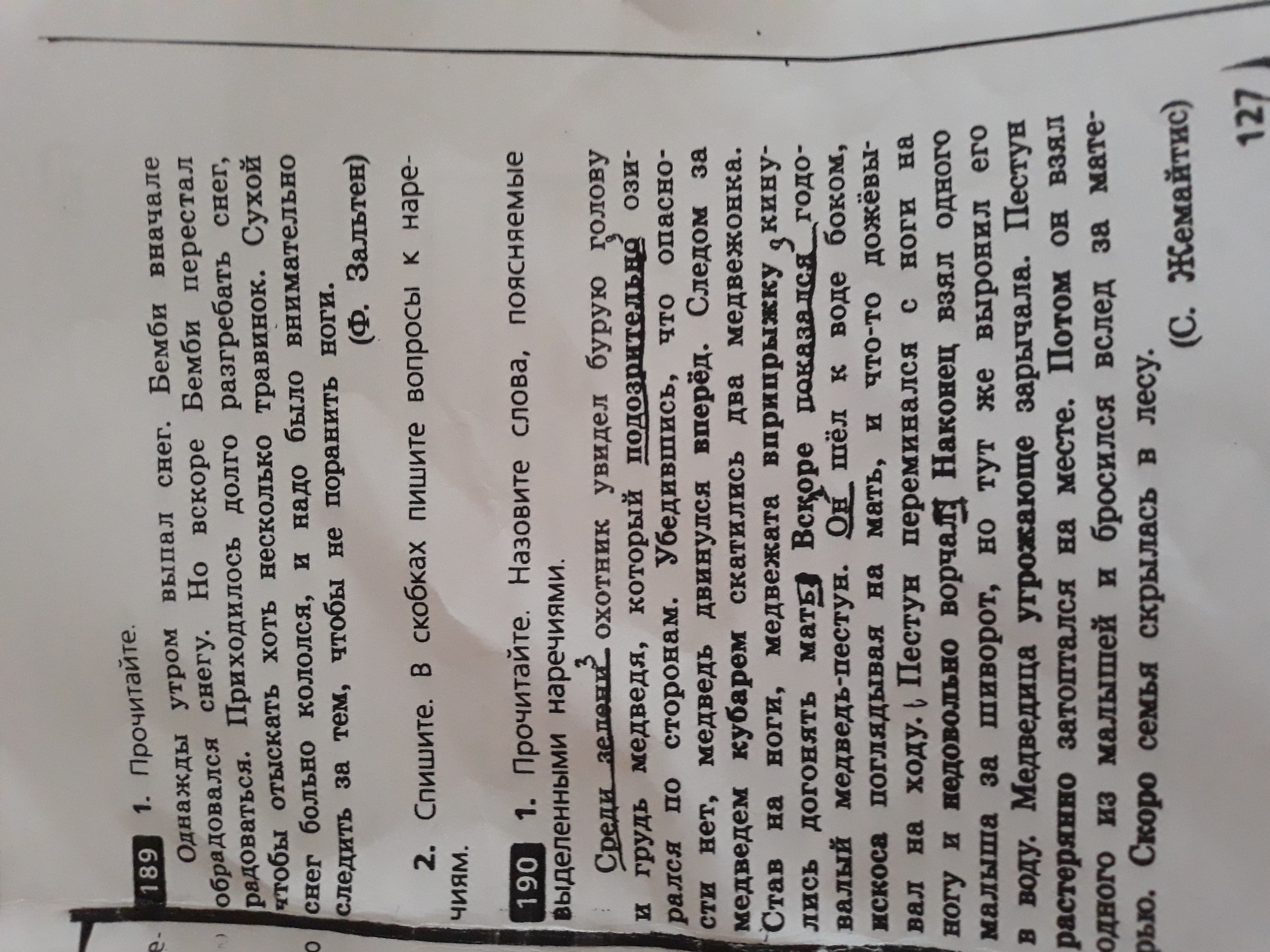 (когда?) Однажды утром выпал снег. Бемби (когда?) вначале обрадовался снегу. Но (когда?) вскоре Бемби перестал радоваться. Приходилось (как?) долго разгребать снег, чтобы отыскать хоть (сколько?) несколько травинок. Сухой снег (как?) больно кололся, и надо было (как?) внимательно следить за тем, чтобы не поранить ноги.