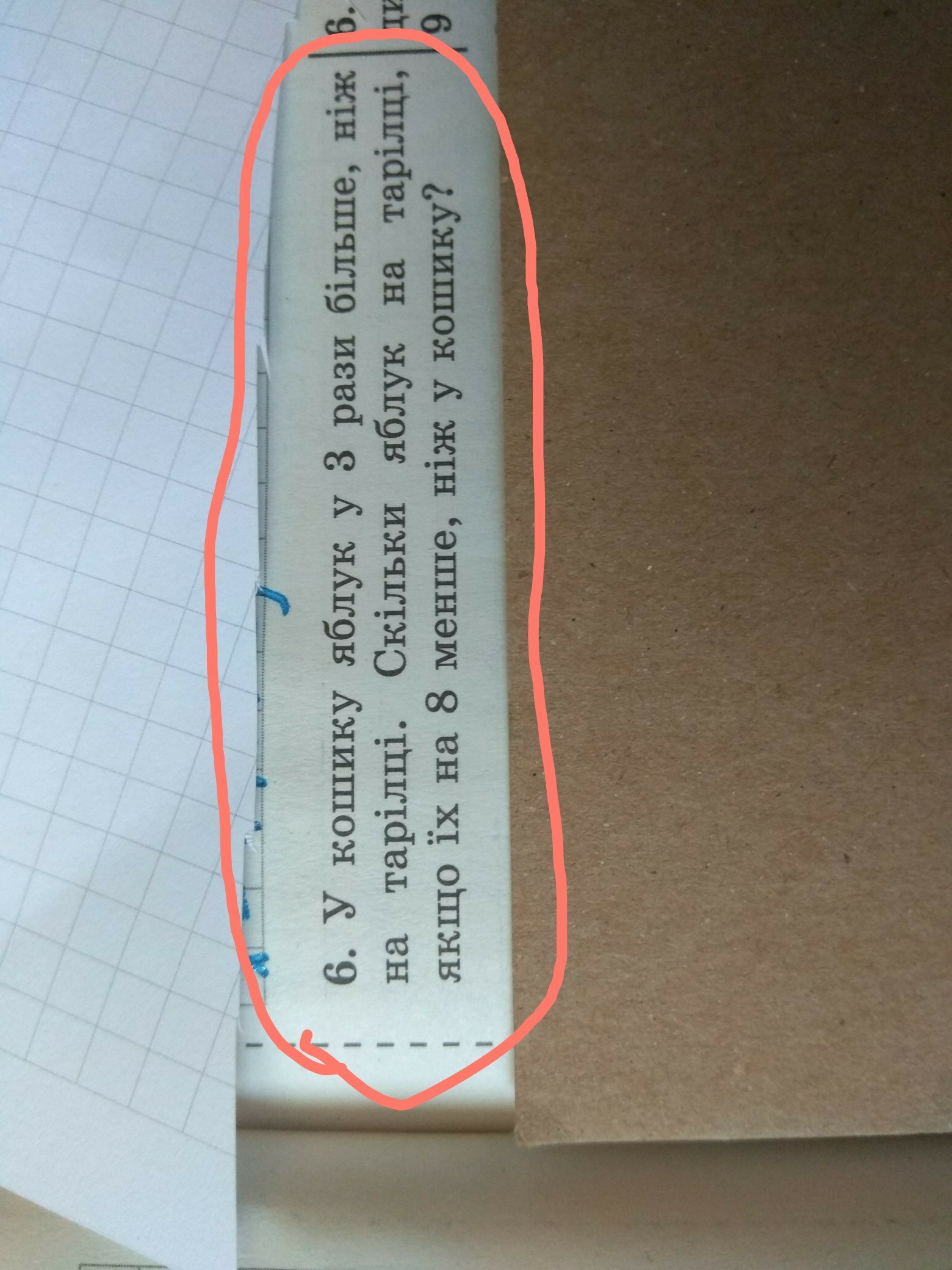 У кошику яблук у 3 рази більше , ніж на тарілці. Скільки яблук на нарілці , якщо їх на 8 менше , ніж у кошику?