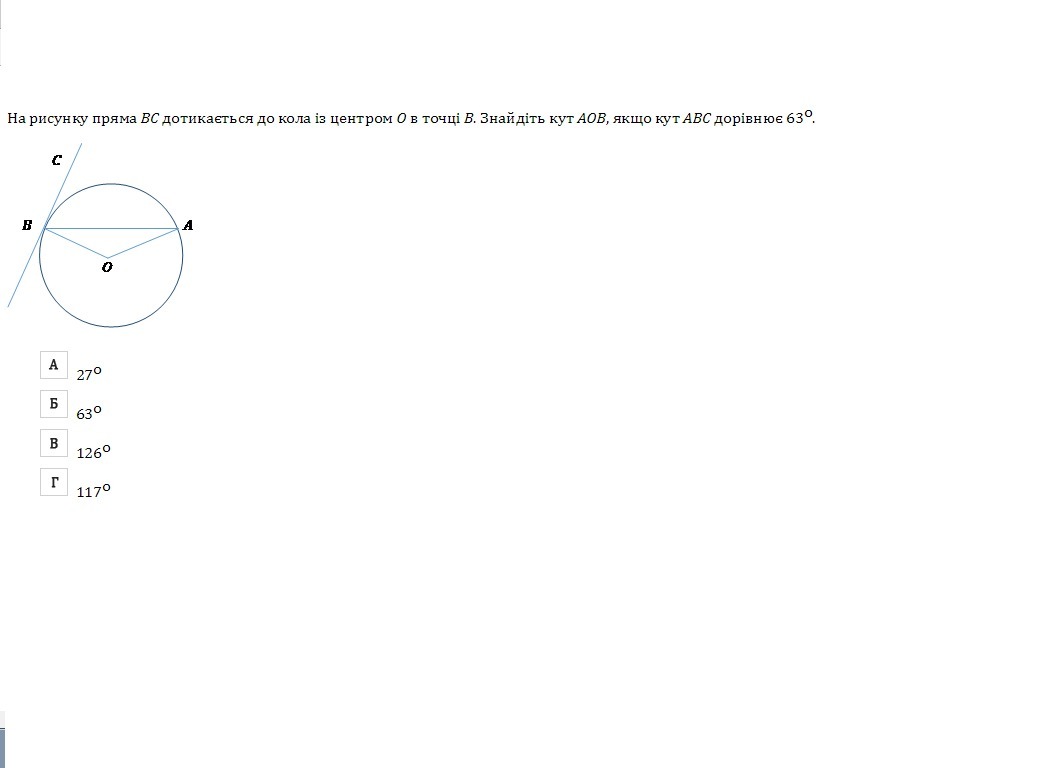 ответ В, находим угол В90-63=27 отсюда следует что и угол А = 27 с этими данным может найти угол О 180-(27+27)=126