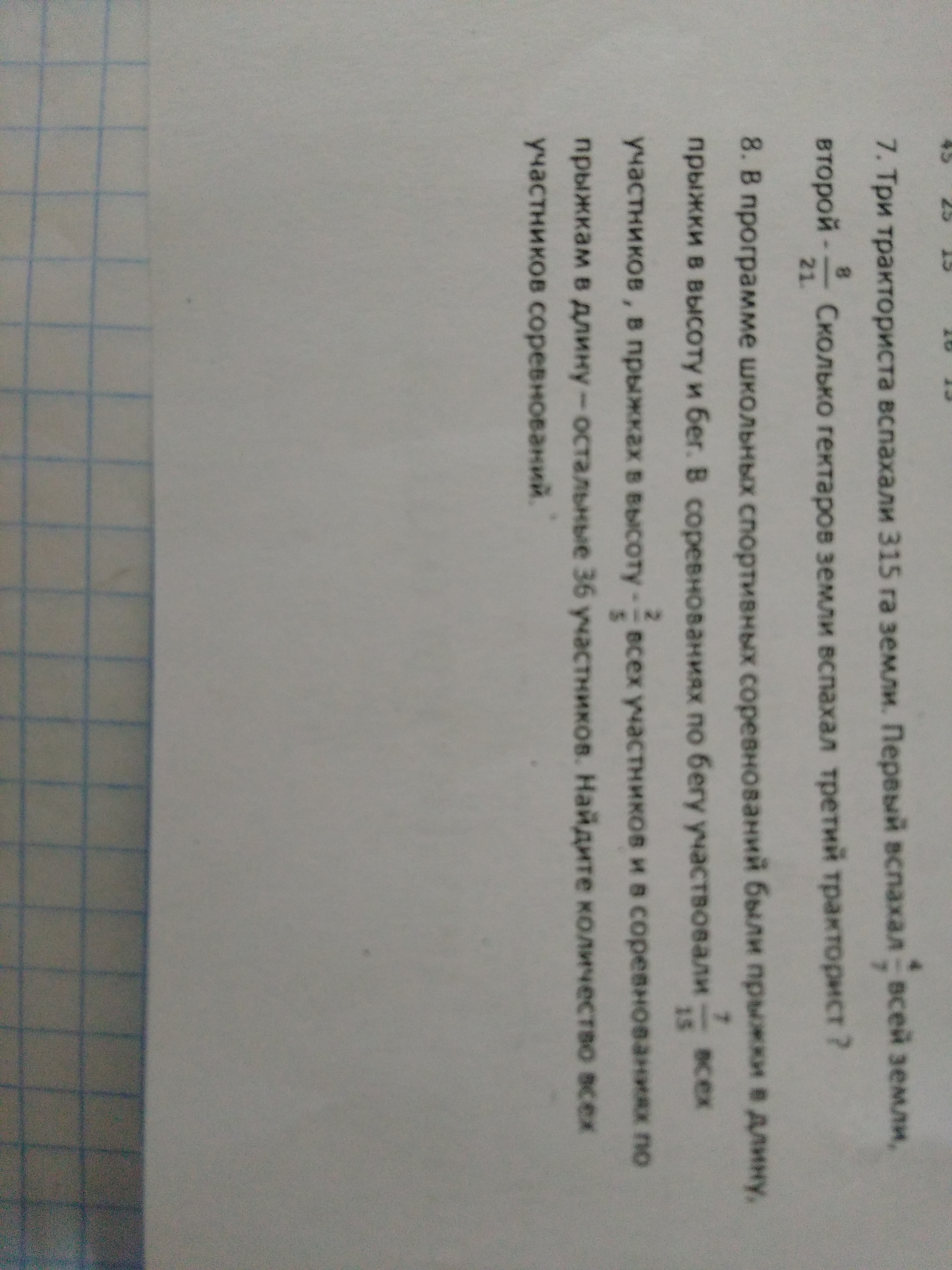 1) 4/7 + 8/21 = 12/21 + 8/21 = 20/21 - вспахали два тракториста вместе