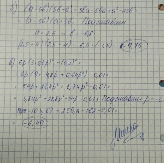 б)(a-5b)(5b+a) при a=2.5, при в= -0,8