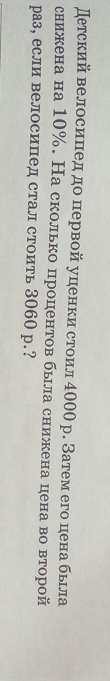 После второй уценки он стоит 3060. Для того, чтобы узнать на сколько процентов стоимость уменьшилась, нужно от 3600 отнять 3060, и получиться 540. На 1 % приходится 36 рублей (потому что 3600 : 100 =36) .