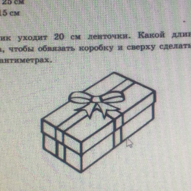 В магазине подарков продавщица упаковывает подарки в коробку , красиво перевязывая их ленточкой с бантиком. Коробка имеет размер: длина 40 см ширина 25 см высота 15 см. На бантик уходит 20 см ленточки. Какой длины потребуется ленточка чтобы обязать коробку и сверху сделать бантик? Ответ дайте в сантиметрах.