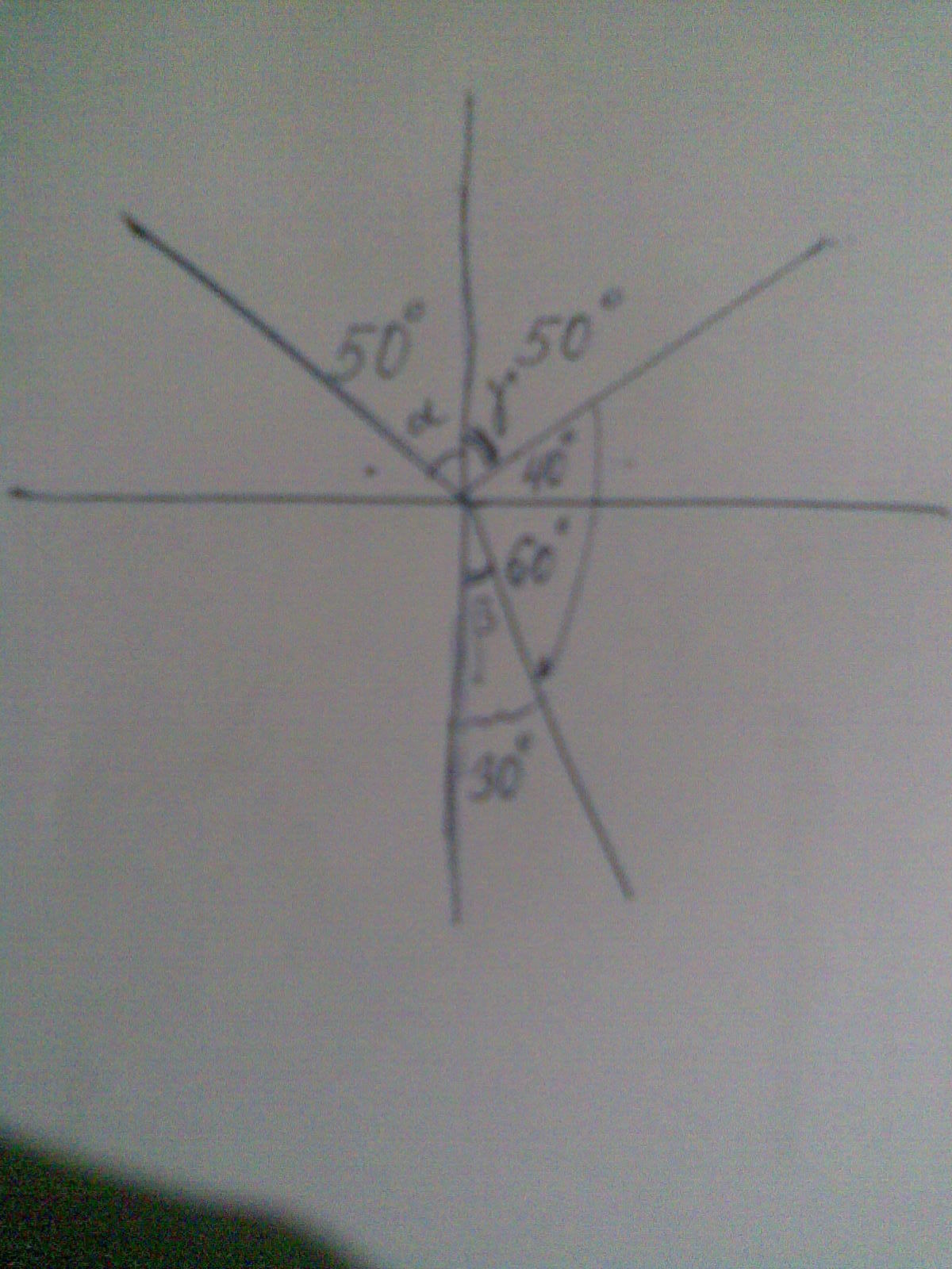Лучь света падает на плоскую границу раздела двух сред. Угол падения равен 50градусов угол между отраженным лучом и преломленным 100градусов. Чему равен угол преломления?