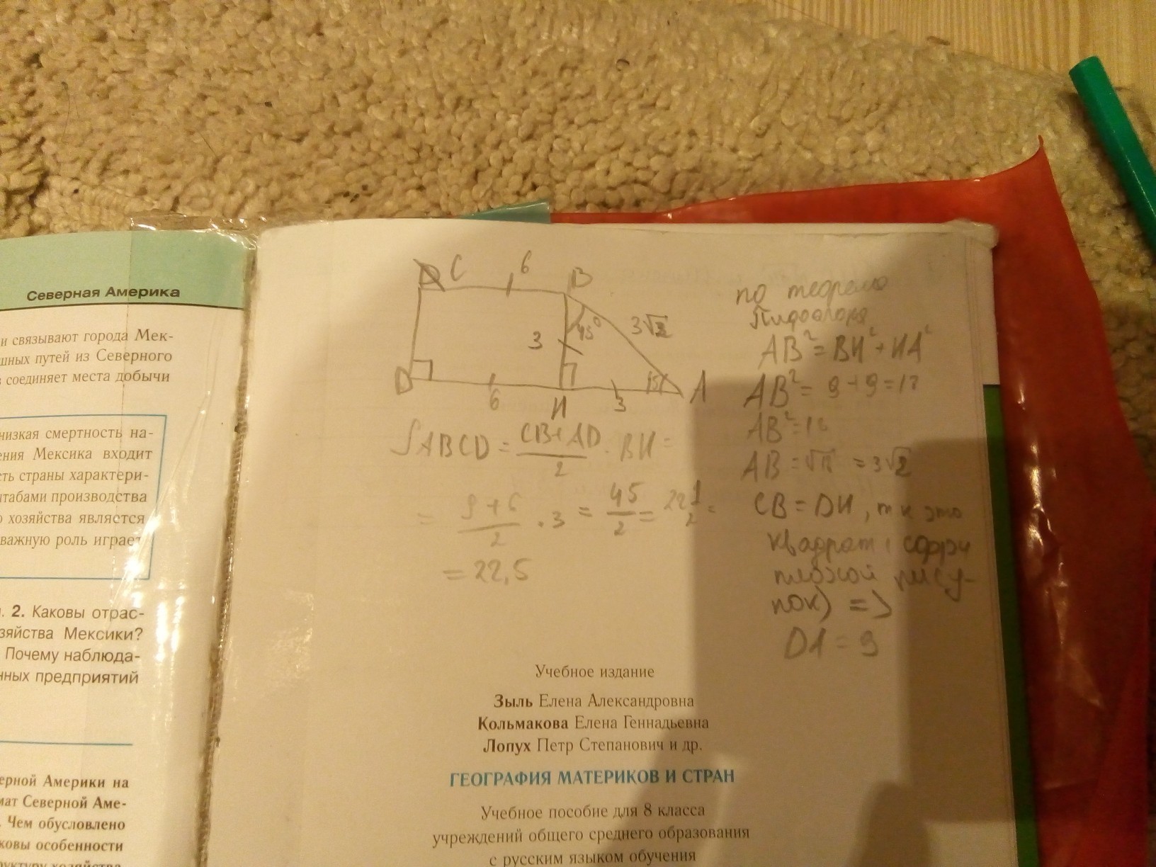 1) у прямокутній трапеції гострий кут А дорівнює 45 градусів, а висота, проведена з вершини тупого кута ділить більшу основу на відрізки 3 і 6 см, починаючи від точки А. Знайдіть площу трапеції