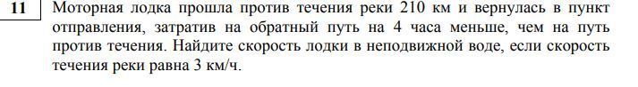 Всего 210 км, значит 210/(х+3) часов - время, которое затратила лодка ПО течению, а 210/(х-3) часов - время, которое затратила лодка ПРОТИВ течения.