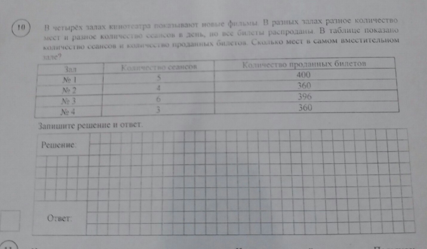 В четырёх залах кинотеатра показывают новые фильмы. В разных залах разное кол-во мест и разное количество сеансов в день, но все билеты распроданы. В таблице показано количество сеансов и количество билетов. Сколько мест в самом влестительном зале?