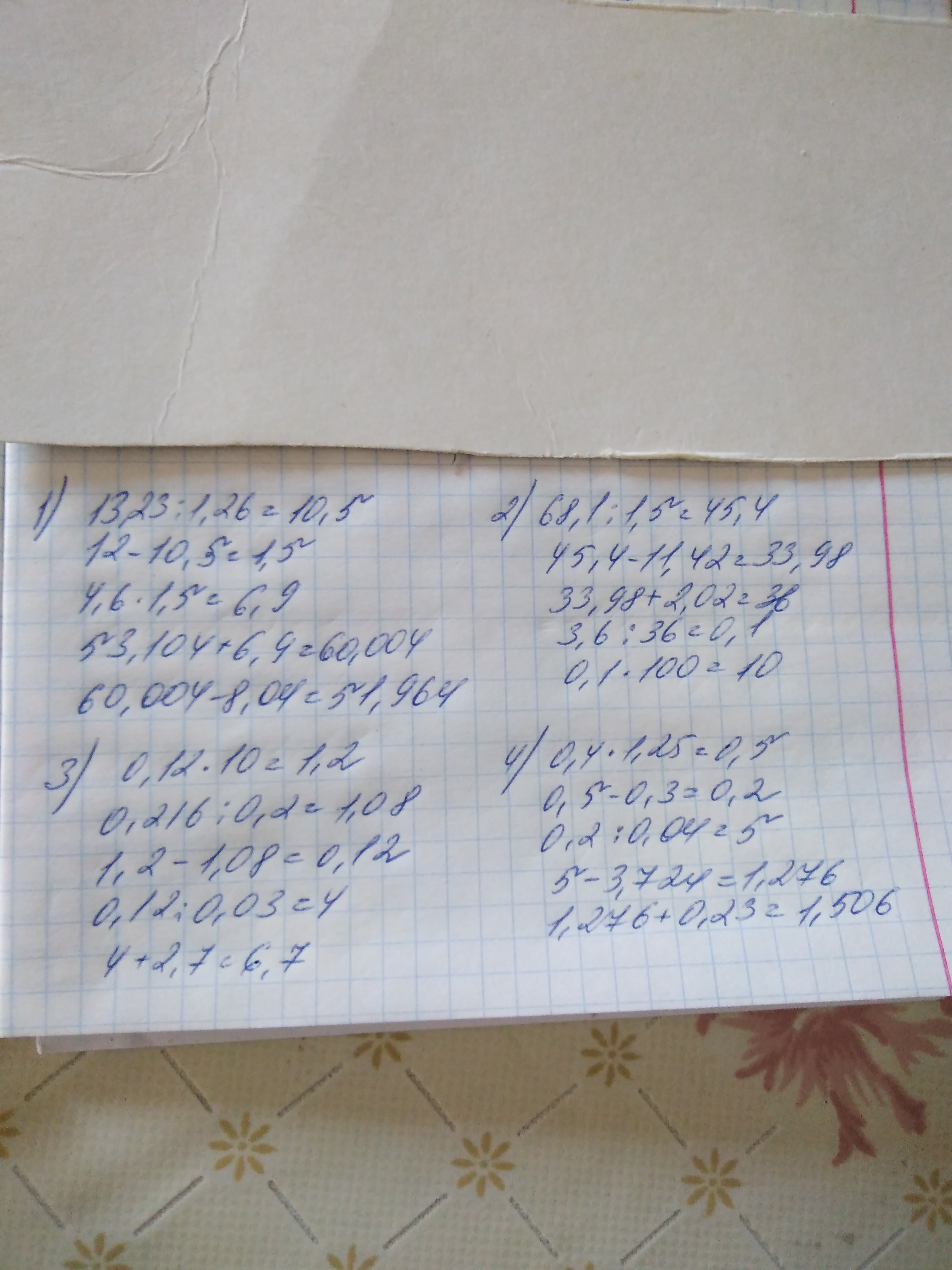 3) (0,12 * 10 – 0,216 : 0,2) : 0,03 + 2,7 4) (0,4 * 1,25 – 0,3) : 0,04 – 3,724 + 0,23