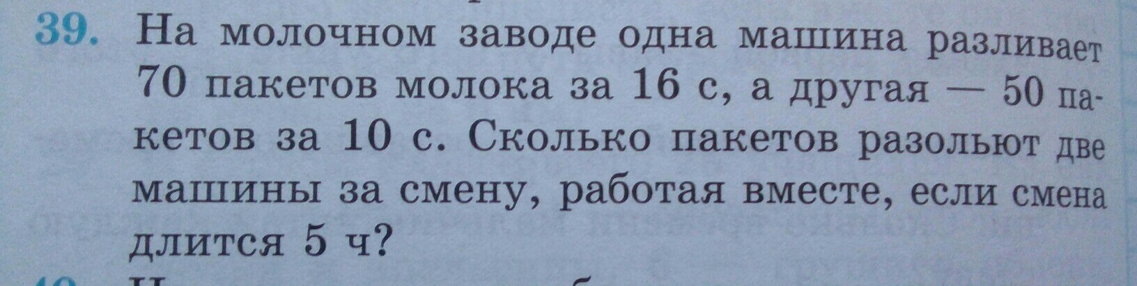 на молочном заводе одна машина разливает 70 пакетов молока по 16 секунд, а другая — 50 пакетов по 10 секунд. Сколько пакетов разольют две машины за смену, работая вместе, если смена длится 5 часов? .... помогитееееее