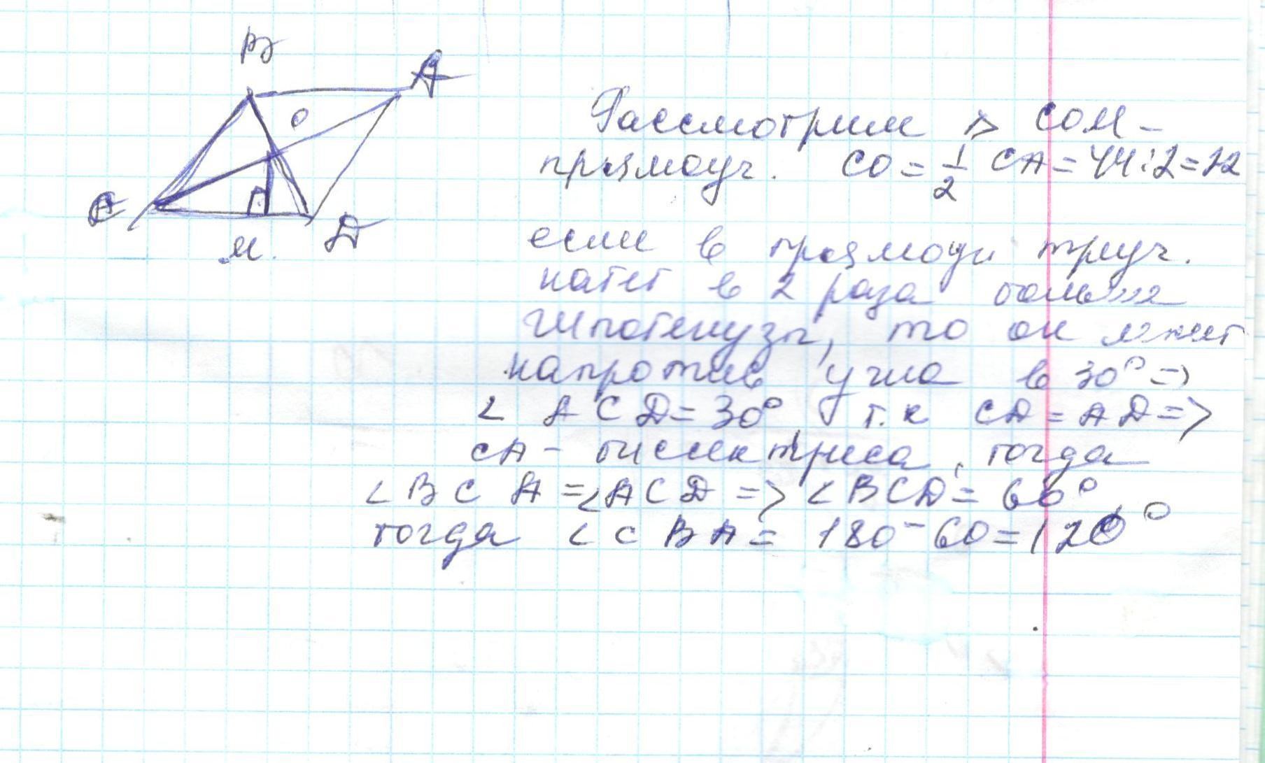 Расстояние от точки О пересечения диагоналей AC и BD ромба ABCD до стороны CD равно 11. Найдите углы ромба, если одна из его диагоналей равна 44. дайте ответ в градусах.