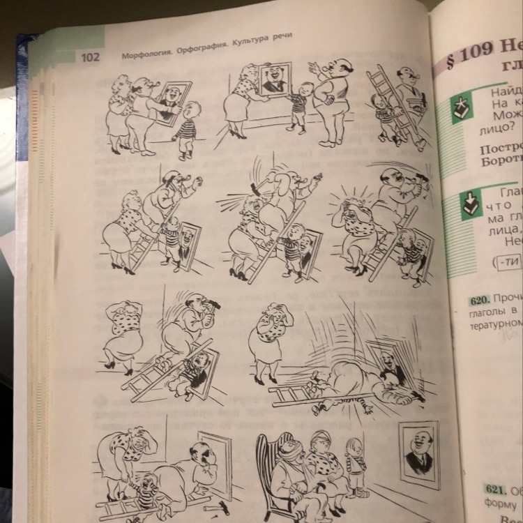 Папа забрался на лестницу, держа в зубах гвозди, а в руке - молоток. Послышался глухой стук: это папа случайно тюкнул маму по голове. Одержимая болью, мама схватилась за голову и отпустила лестницу. Лестница упала на меня, я почувствовал всю тяжесть папы и заревел от боли.