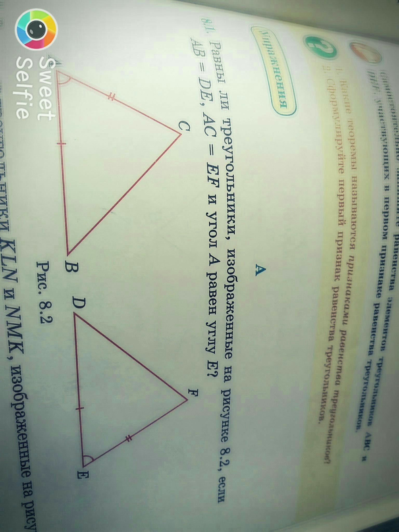 Да, треугольник ABС равен треугольнику DFE по первому признаку треугольников.