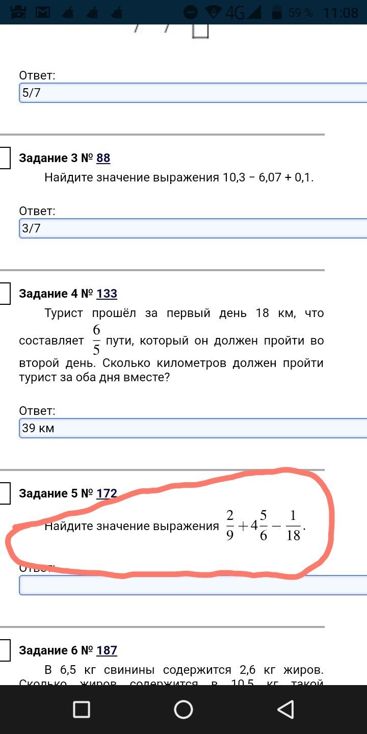 1) 2/9+ 5/6+4= 4/18+ 15/18+4=19/18+4=5 1/18