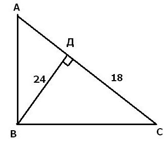 гипотенуза ВС = корень из (18*18+24*24)=корень из 900=30 см