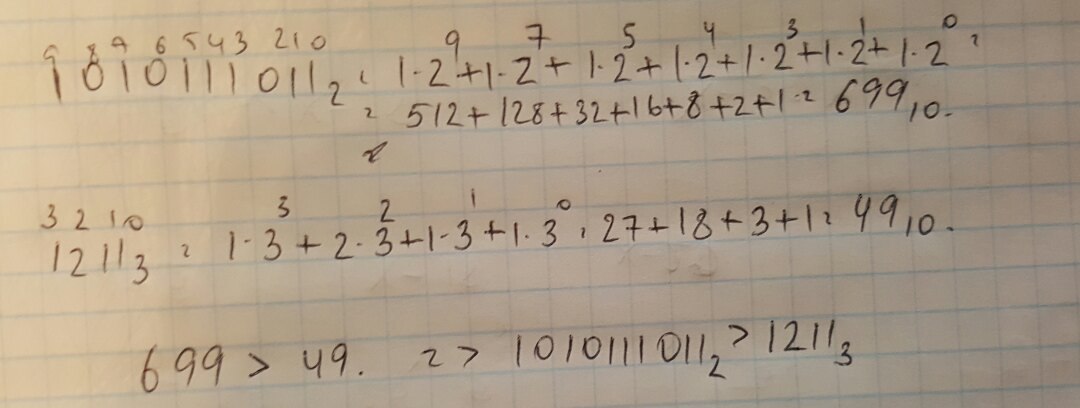 Ответ: 1010111011₂ > 1211₃.