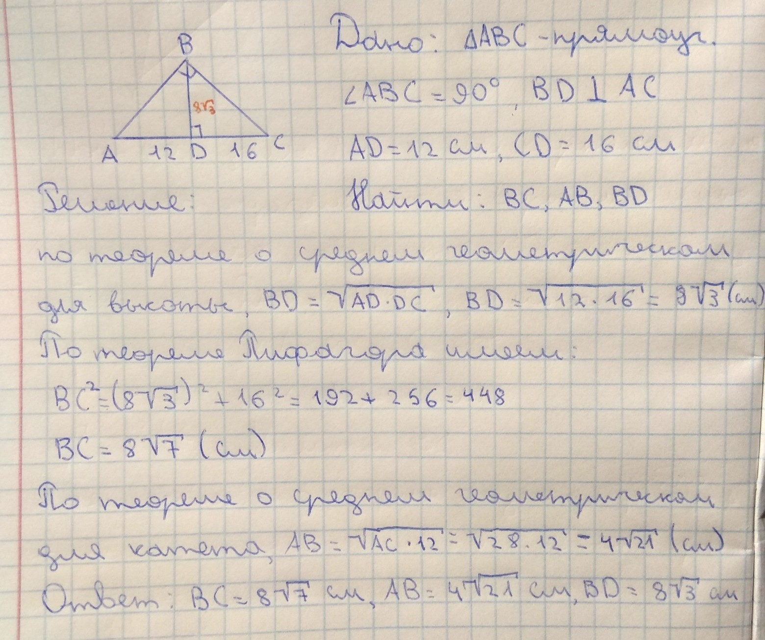 В треугольнике АВС ,угол АВС=90 градусам,ВД перпиндикулярна АС, АД=12 см,СД=16 см,найдите длины сторон, ВС,АВ,ВД.