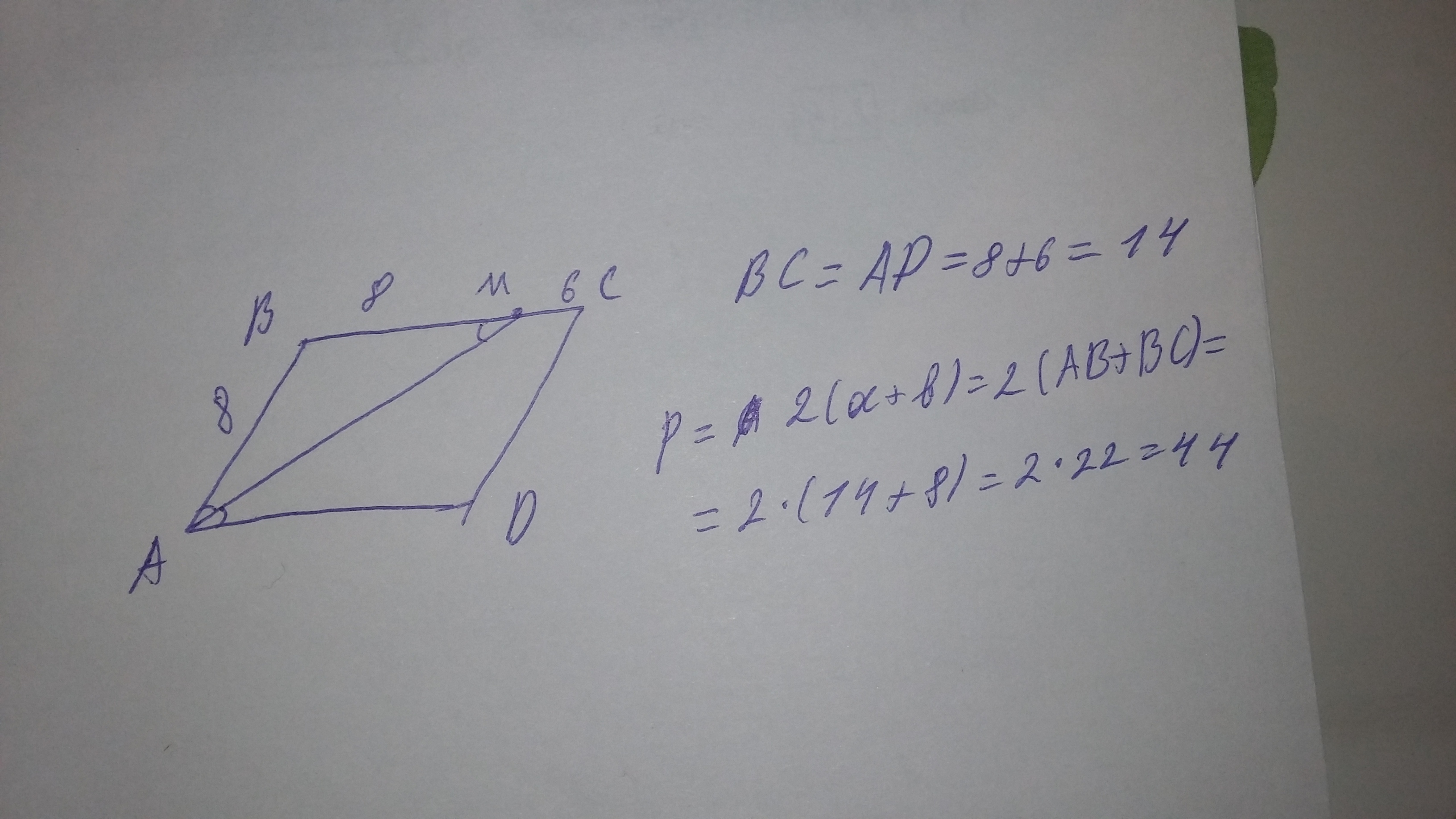 так как это параллелограмм, то AD параллельно BC и они равны 8+6=14, угол MAD равен углу AMB накрест лежащие углы равны при двух параллельных прямых, получается треугольник ABM равнобедренный и AB=BM=8, S=2*(14+8)=2*22=44.