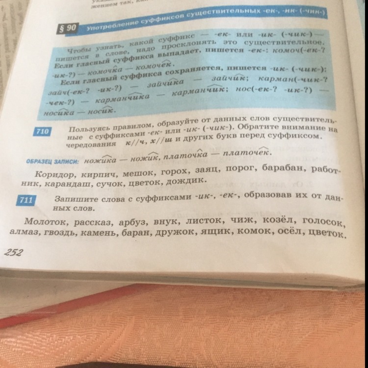 молоточек, рассказик, арбузик, внучек, листочек, чижик, козлик, голосочек, алмазик, гвоздик, камешек, барашик, дружочек, ящичек, комочек, цветочек