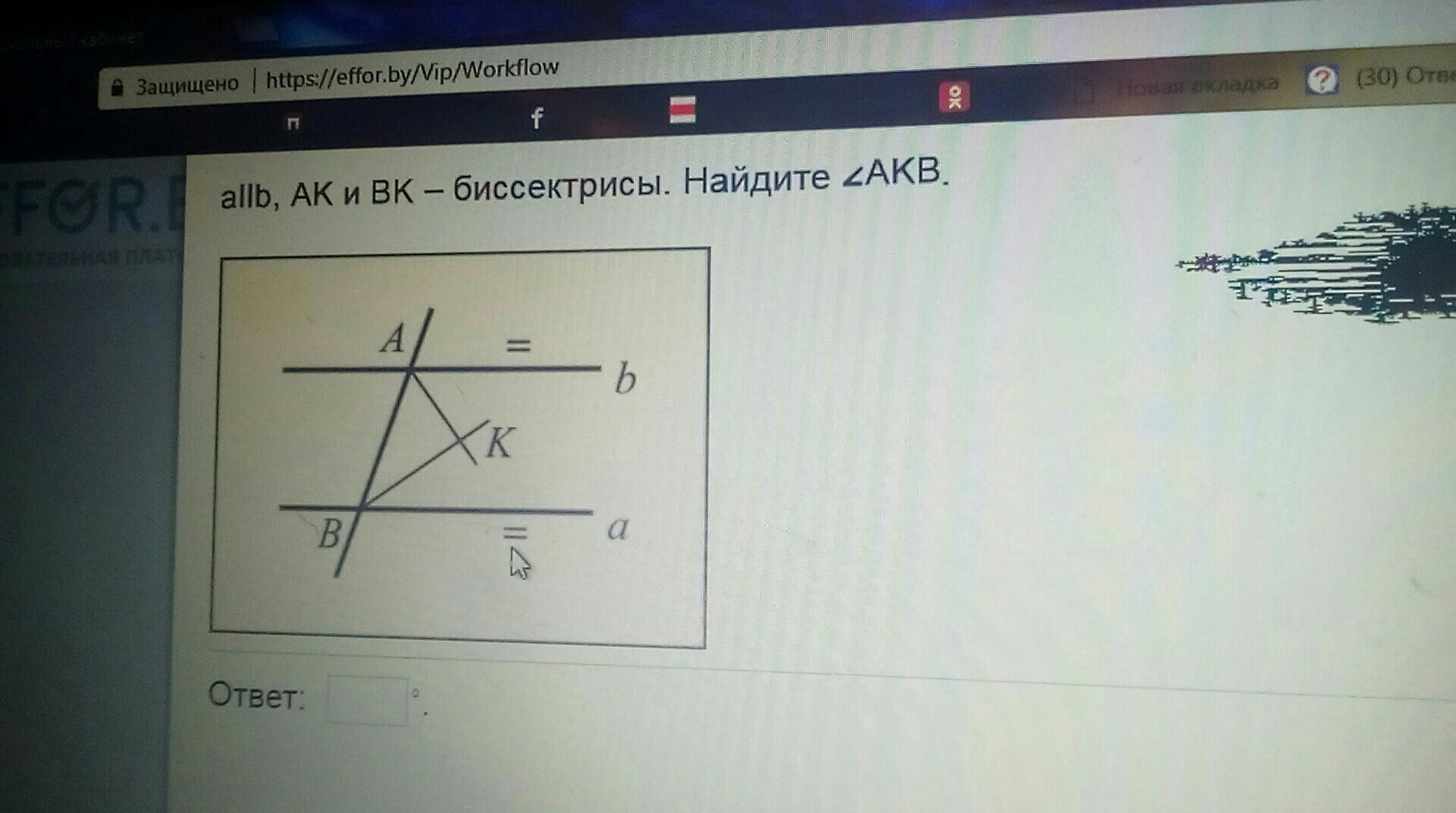 а║в, АВ - секущая, значит по свойству внутренних односторонних углов аВА+ВАb=180°, АК, ВК -биссектрисы, значит сумма этих углов будет равна 180/2=90°.
