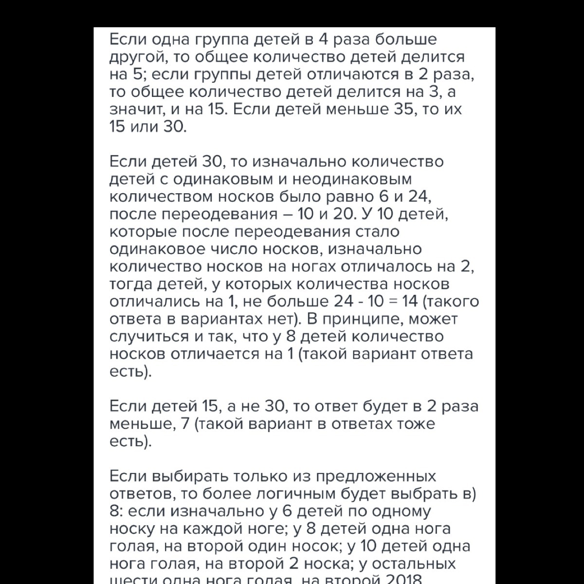 Собираясь в детском саду на прогулку, дети надевали среди прочего носки. Уже на улице выяснилось, что тех из детей, у кого на ногах поровну носков, в 3 раза меньше, чем тех, у кого не поровну. Воспитательница, видя это безобразие, велела каждому ребёнку снять носок с одной ноги и надеть на другую. В результате тех, у кого на ногах носков поровну, стало в 4 раза меньше, чем тех, у кого не поровну. У какого наибольшего количества детей (из предложенных ниже вариантов) в начале прогулки число носков на ногах могло отличаться на 1, если известно, что общее количество детей меньше 35? Помогите пожалуйста, умоляю ! Дам 14 баллов, это все что у меня есть !