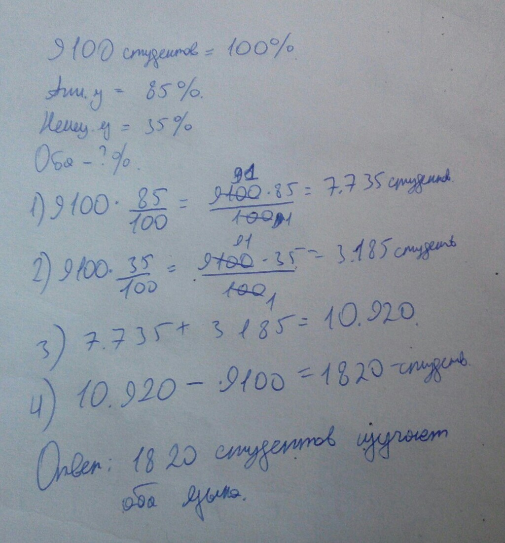 В институте 9 100 студентов. Каждый студент изучает хотя бы один из двух иностранных языков: английский и немецкий. Английский язык изучают 85% студентов, а 35% - немецкий. Сколько студентов изучают оба языка? Ребята, помогите пожалуйста...