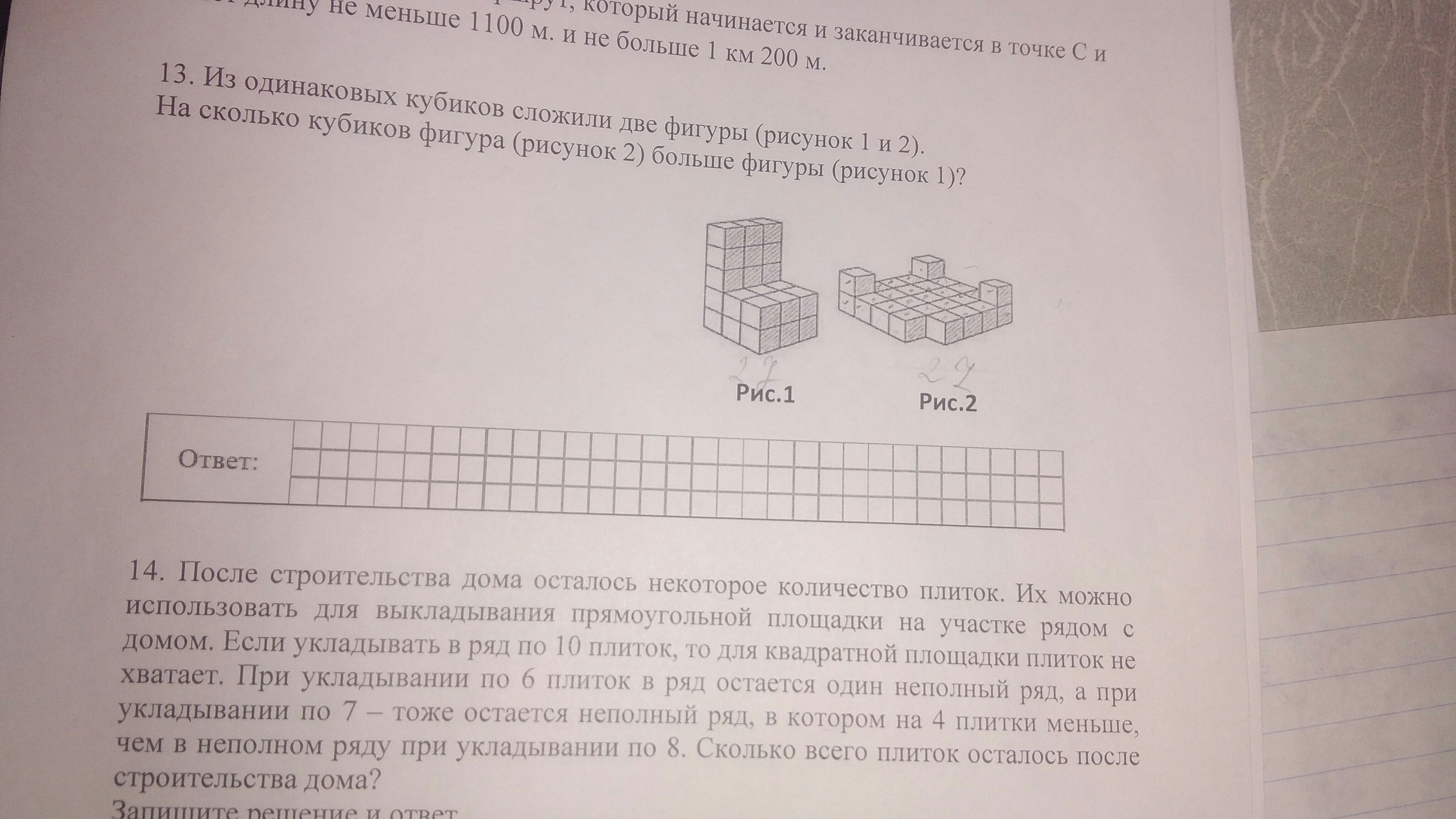 Из одинаковых кубиков сложили две фигуры (рисунок 1 и 2). На сколько кубиков фигура (рисунок 2) больше фигуры (рисунок 1)