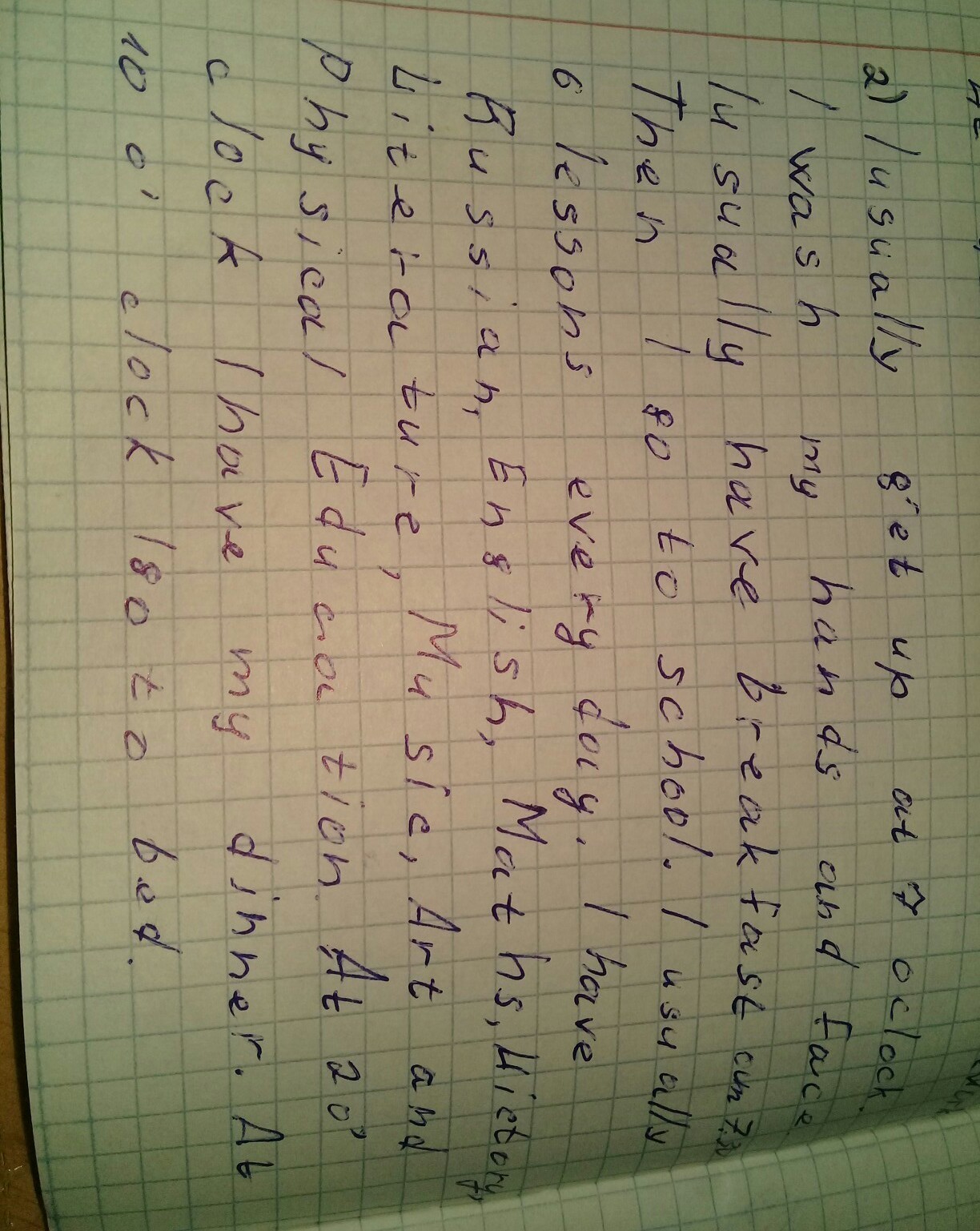 Ай южали гет ап эт сэвэн оклок. Ай вош май хэндс энд фейс. Ай южали хэв брекфэст эт сэвэн фёрти. Зен ай гоу ту скул. Ай южали хэв сикс лесонс евери дэй. Ай хэв рашн,инглиш, мьюзик, арт энд физикал эдьюкейшн. Эт твенти оклок ай хэв май диннер. Эт тэн оклок ай гоу ту бэд.