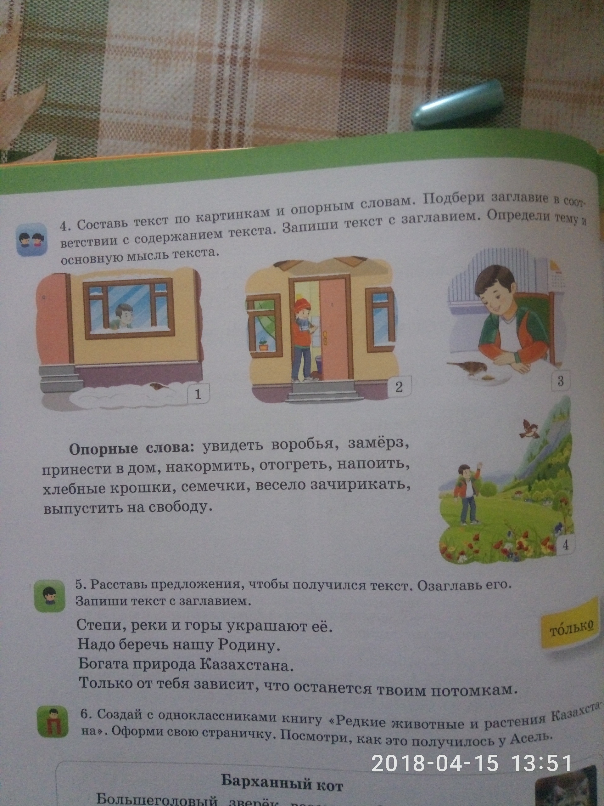 4)я увидел воробья.Он замёрз.Я принёс его домой.Я дал ему хлебные крошки,накормил,отогрел,напоил,семечки.Я решил его выпустить на свободу.Он весело зачирикал и улетел. можно назвать Воробей,или Доброе дело.