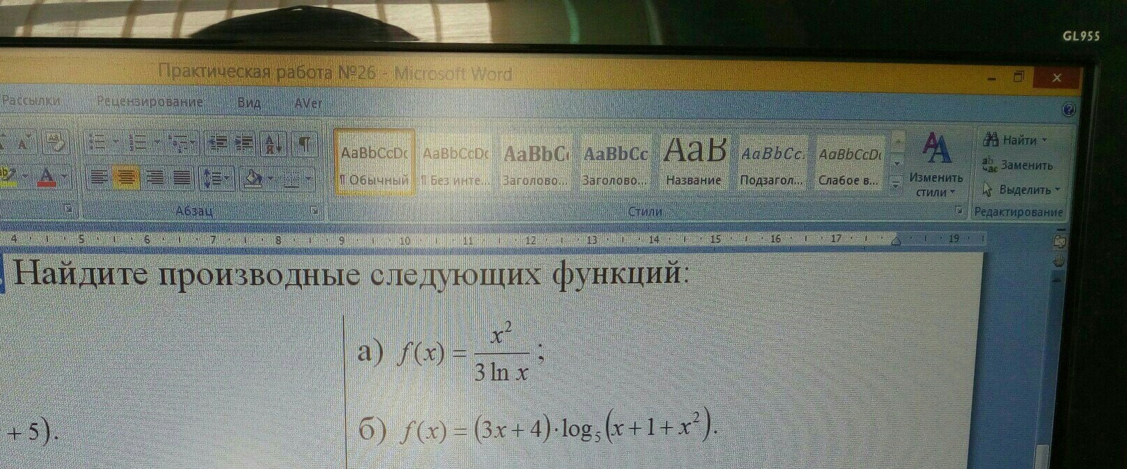 y= frac{x^2}{3ln(x)} \y'= frac{(x^2)'3ln(x)-x^2(3ln(x)'}{(3ln(x))^2} \y'= frac{6xln(x)-3x}{9ln^2(x)} = frac{2xln(x)-x}{3ln^2(x)} \y=(3x+4)(log_3(x+1+x^2)\y'=(3x+4)'log_3(x+1+x^2)+(3x+4)(log_3(x+1+x^2))'\y=log_a(b)\y'= frac{1}{ln(a)*b} *b'\= textgreater  \y'=3log_3(x+1+x^2)+ frac{3x+4}{ln(3)(x+1+x^2)} *(1+2x)