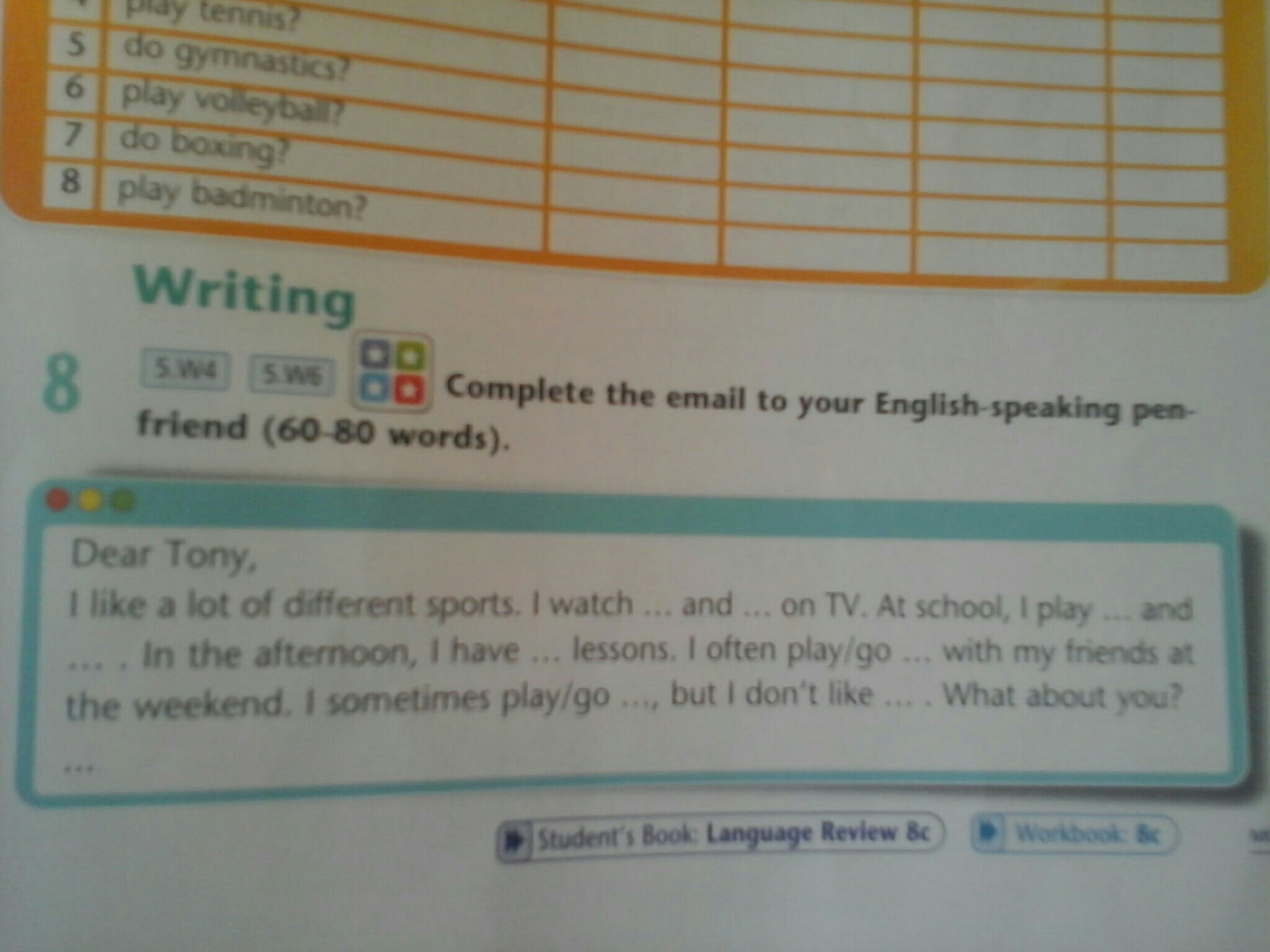 I like a lot of different sports. I watch football and boxing on TV. At school, I play volleyball and tennis. In the afternoon,I have 6 lessons. I often play table tennis, but I don't like karate. What about you?....