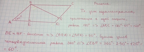 в параллелограмме abcd be и bf перпендикуляры сторонам ad и cd соответственно. его острый угол равен 60 градусов. найдите углы образовавшегося четырёхугольника bfde помогите