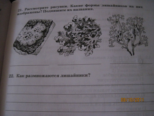 Рассмотрите рисунки.Какие формы лишайников на них изображены?Подпишите их названия.