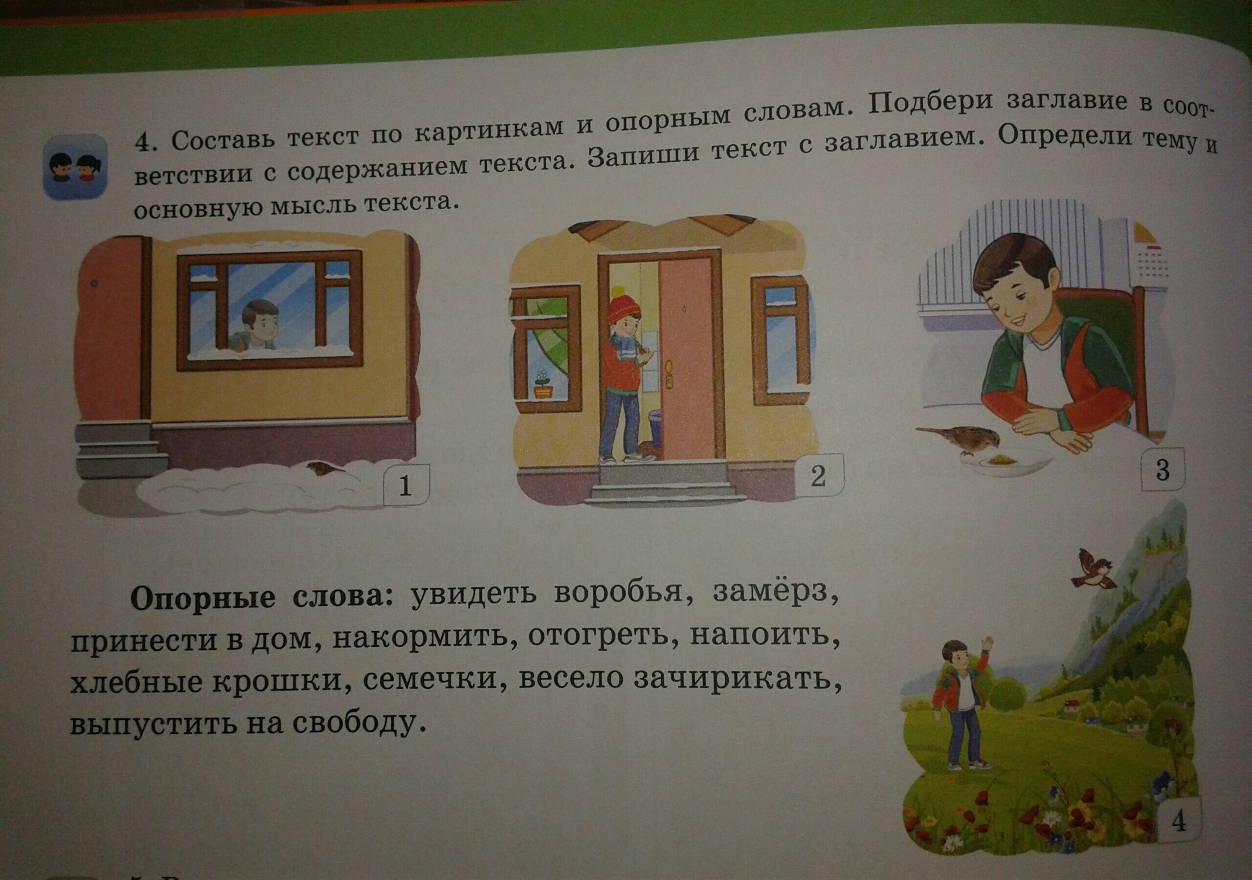 составь текст по картинкам и опорным словам. Подбери заглавие в соответствии с содержанием текста. Запиши текст с заглавием. Определи тему и основную мысль текста.