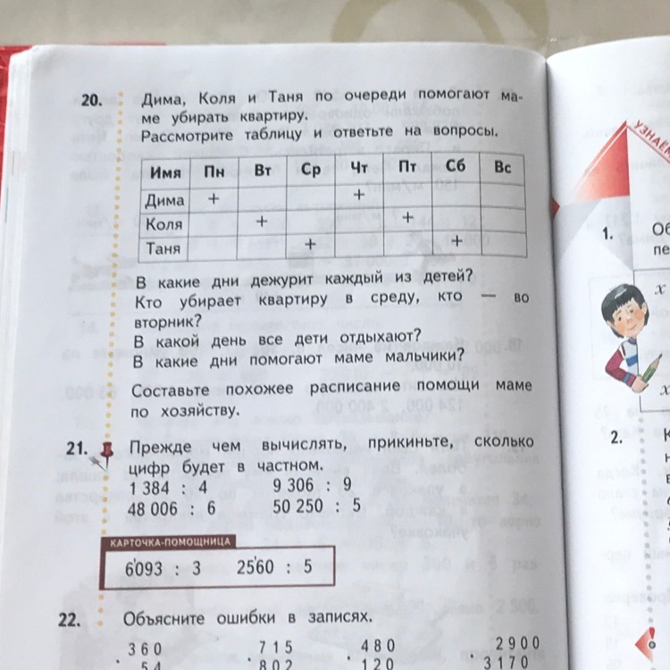 Дима убирает в понедельник , Коля во вторник ,а Таня в среду. В четверг убирает снова Дима ,в пятницу Коля,а в субботу Таня .Все дети отдыхают в воскресенье .