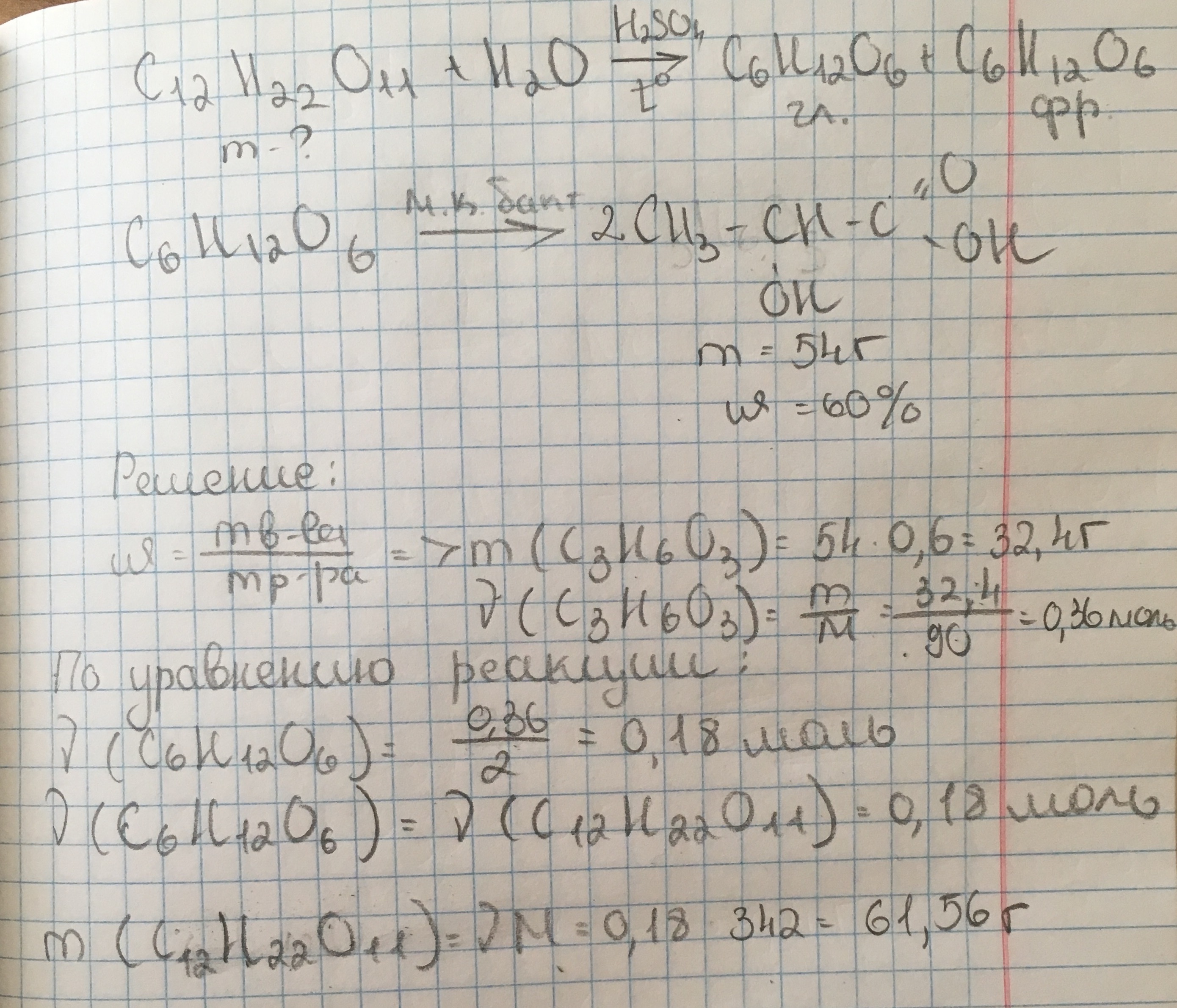 Помогите, пожалуйста! Вычислите массу сахарозы подвергшуюся гидролизу с учетом того, что из образовавшейся глюкозы получена молочная кислота массой 54 г. при массовой доле выхода 60%