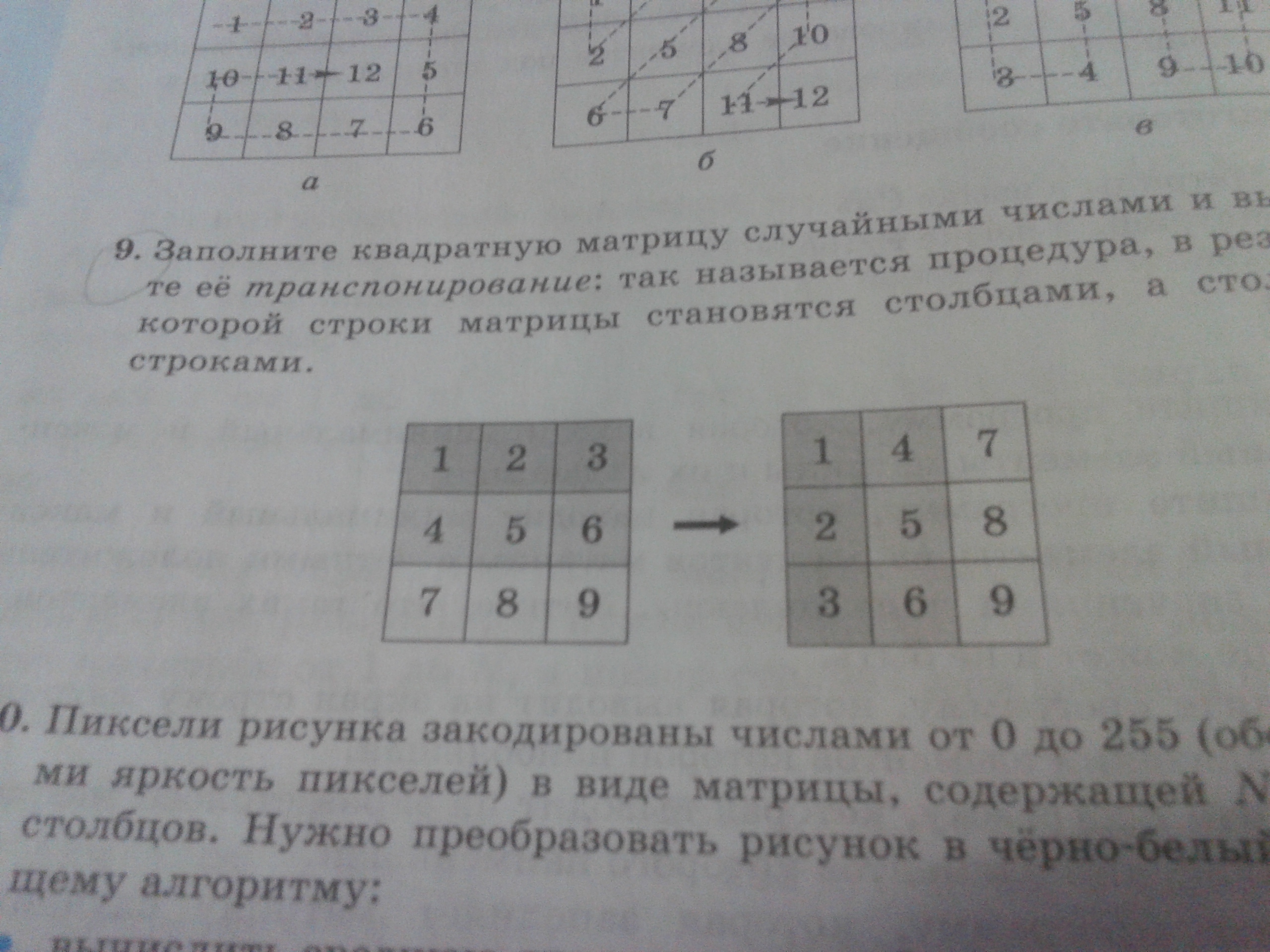 Заполните квадратную матрицу случайными числами и выполните ее транспортирование: так называется процедура,в результате которой строки матрицы становятся столбцами, а столбцы-строками.