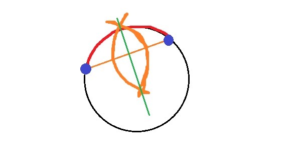 3. Образуются точки пересечения. Через точки пересечения построить прямую, вот получится срединный перпендикуляр к хорде .