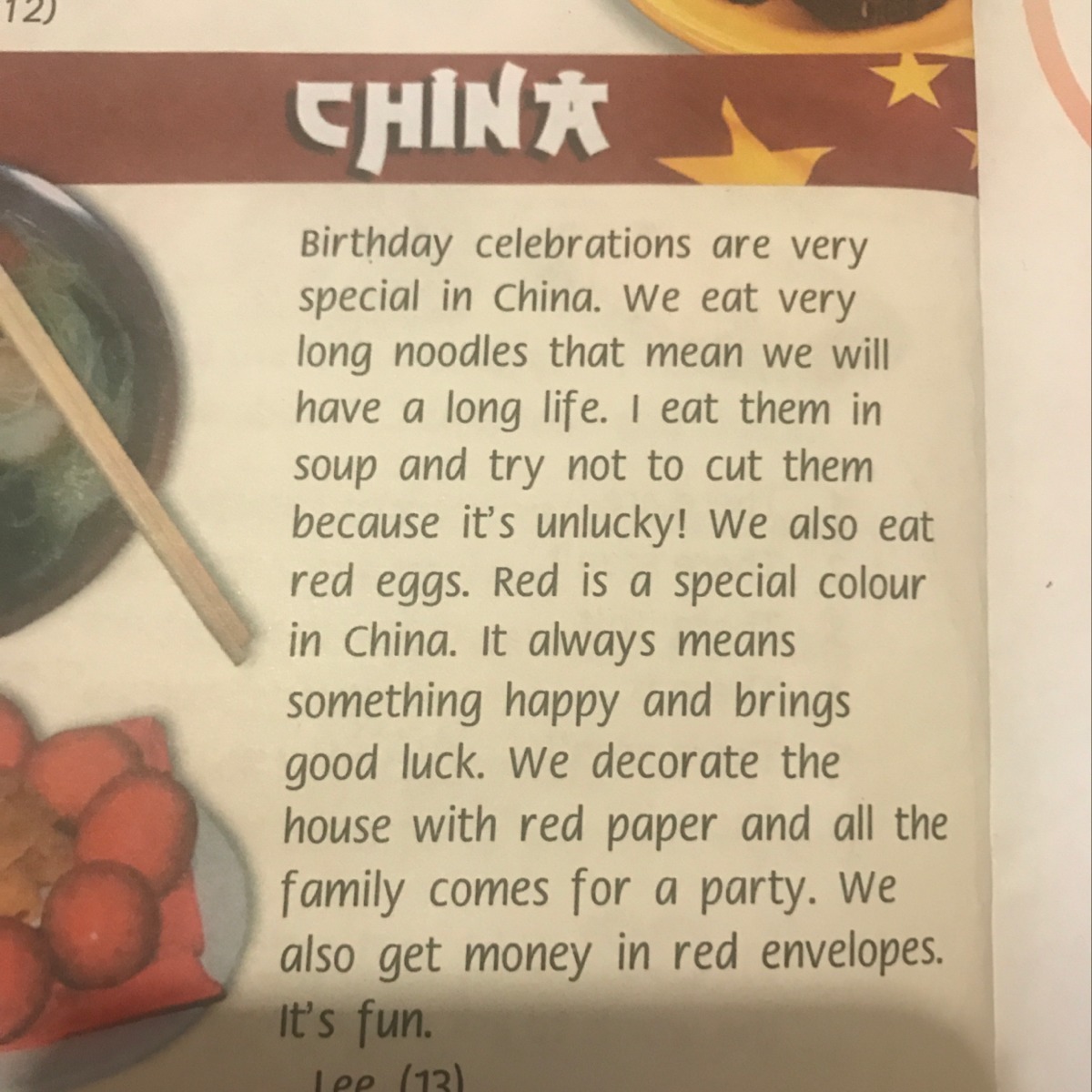 Празднование Дня рождения очень особенное в Китае. Мы едим очень длинную лапшу, что означает, что у нас будет долгая жизнь. Я ем их в супе и стараюсь не резать, потому что это не повезло! Мы также едим красные яйца. Красный цвет особенный цвет в Китае. Это всегда означает что-то счастливое и приносит удачу. мы украшаем