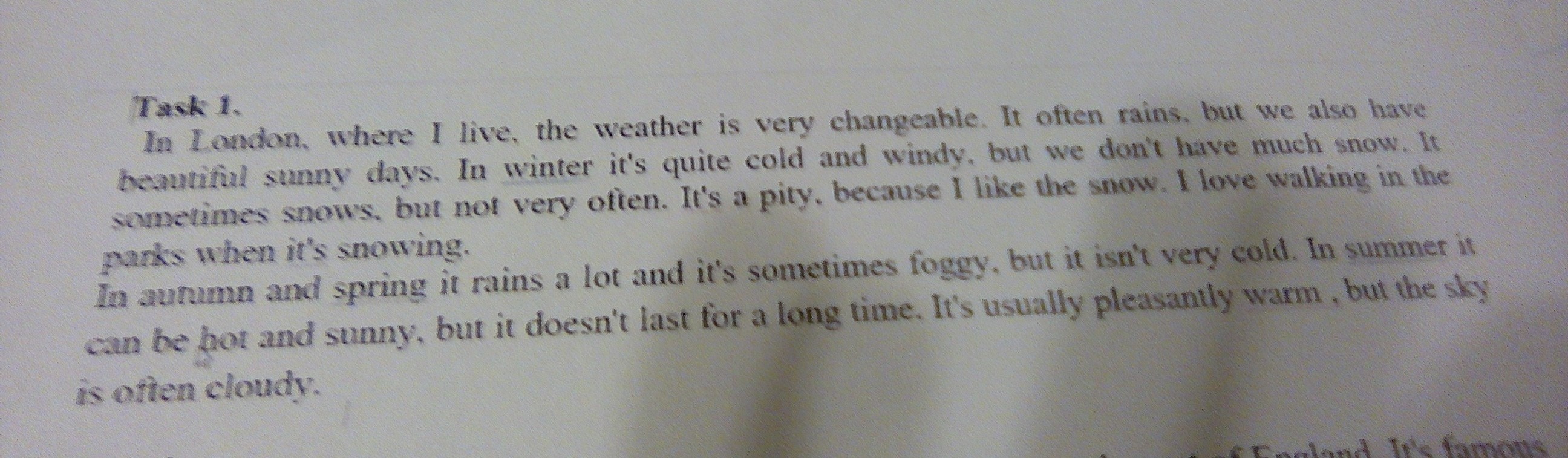 Погода 1-го дня очень изменчива. Часто идет дождь. но у нас также есть в Лондоне, где я живу, но у нас мало снега. красивые солнечные дни. Зимой довольно холодно и ветрено, иногда снега, не очень часто. Жаль. потому что мне нравится снег. Когда идет снег, прогуляйтесь по паркам. Осенью и весной идет дождь, и иногда бывает туманно, но не очень холодно. летом я могу быть бот и солнечно, но это длится недолго. Это обычно приятно тепло, но небо часто пасмурно