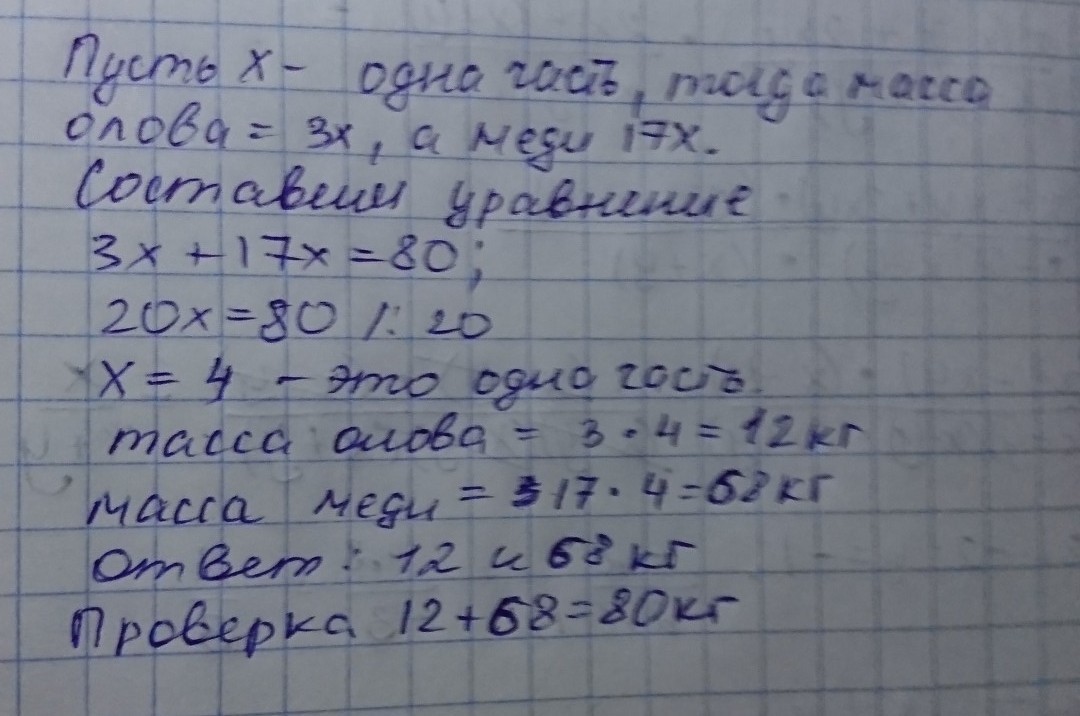 Бронза это сплав олова и меди. Сколько олова и меди содержится в куске бронзы, масса которого 80 кг, если олово и медь входят в неё в отношении 3:17?