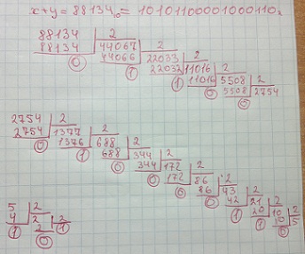 Вычислите сумму чисел x и y, если x=77116, y=11018. Результат представьте в двоичной системе счисления