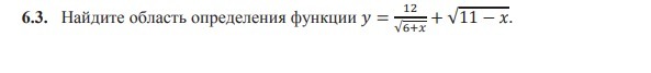 y=frac{12}{sqrt{6+x}}+sqrt{11-x}\\OOF:; ; left { {{6+x textgreater  0} atop {11-x geq 0}} right.; left { {{x textgreater  -6} atop {x leq 11}} right. ; ; Rightarrow ; ; xin (-6;11, ]\\---(-6); /////////; [, 11, ]---