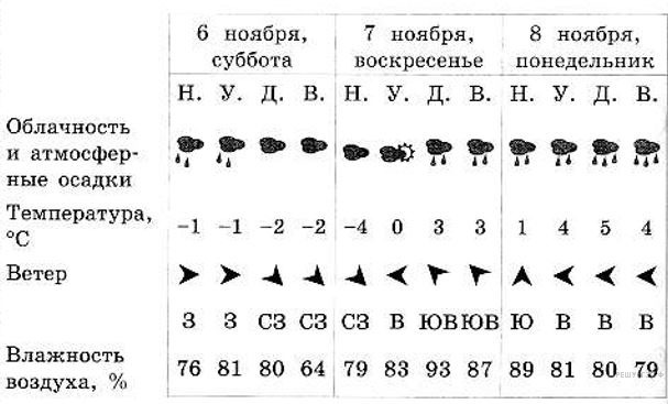 1)в воскресенье ожидается переменный ветер 2)влажность воздуха в понедельник не превысит 90% 3)в субботу выпадет снег который не растает до понедельника 4)самая низкая утренняя температура воздуха в указанные дни недели будет в воскресенье (выбери верные утверждение) пж помогите