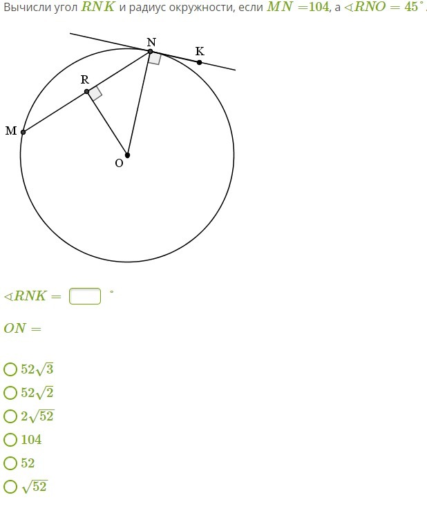 Вычисли угол RNK и радиус окружности, если MN=104, а ∢RNO=45°.