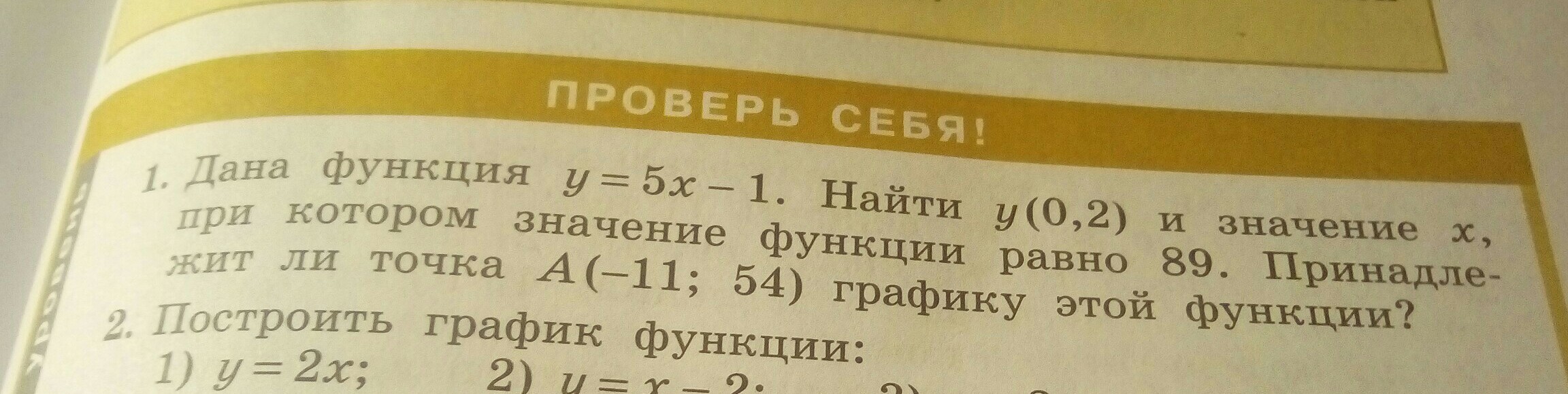 дана функция y=5x-1. найти y(0,2) и значение x при котором значение функции равно 89