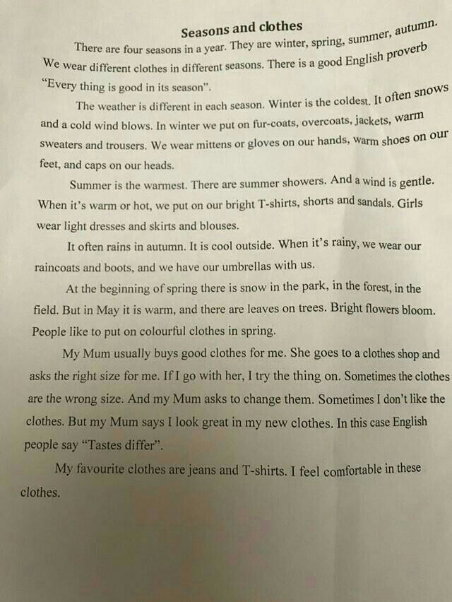 For each season we wear different clothes. So, we wear warm clothes in winter.We wear very light clothes in summer. We wear waterproof suits at autumn. We wear colorful clothes at spring.Parents try to dress their children according to weather. Very often moms buy clothes with right size.But sometimes rather difficult to guess with size for children, so they need to change them.Also, children usually don't like clothers. Many children likes to wear jeans and t-shirts. They feel comfortable themselves in this clothers.
